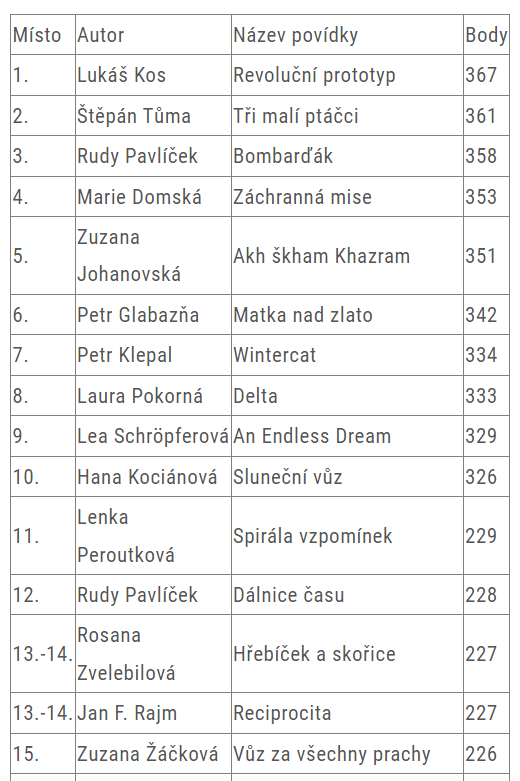 A zde tabulka umístění obou povídek v soutěži (po kliknutí se zvětší)... 🤗