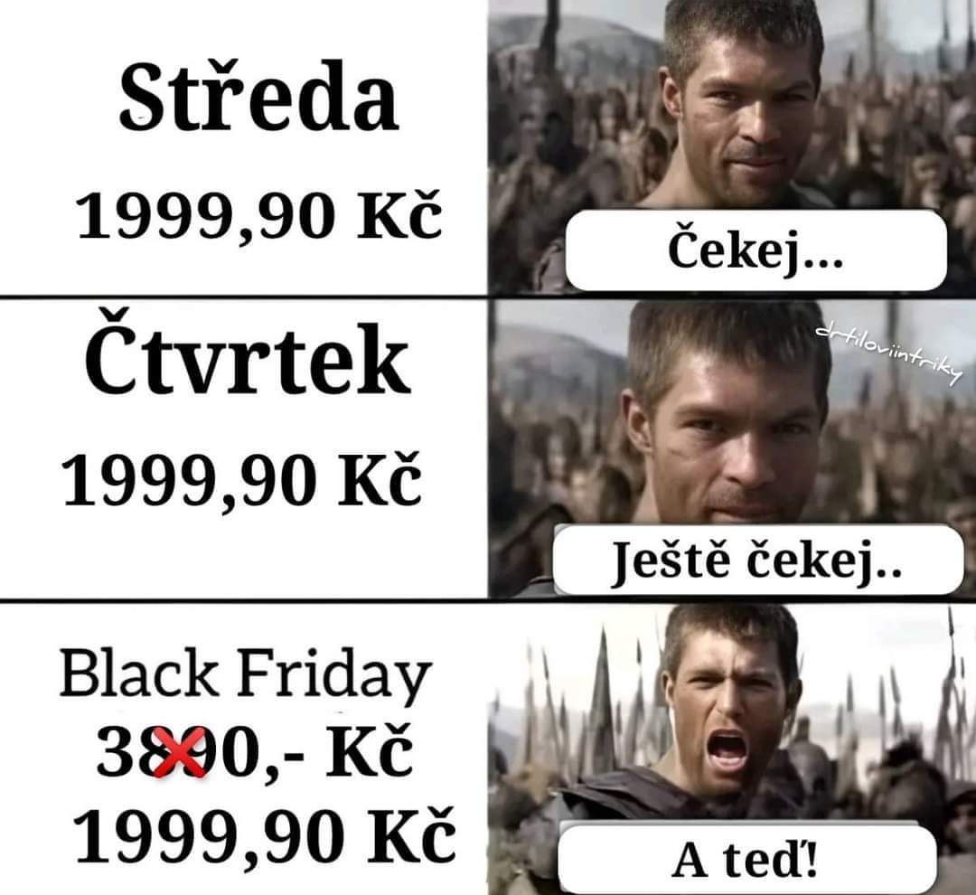 Takhle nějak funguje princip černého pátku. Všichni to víme a přesto všichni bez výjimky obchodníkům na ten trik skočíme. Zaplatíme, poděkujeme a jsme hrdí na ten skvělý kup… 😅