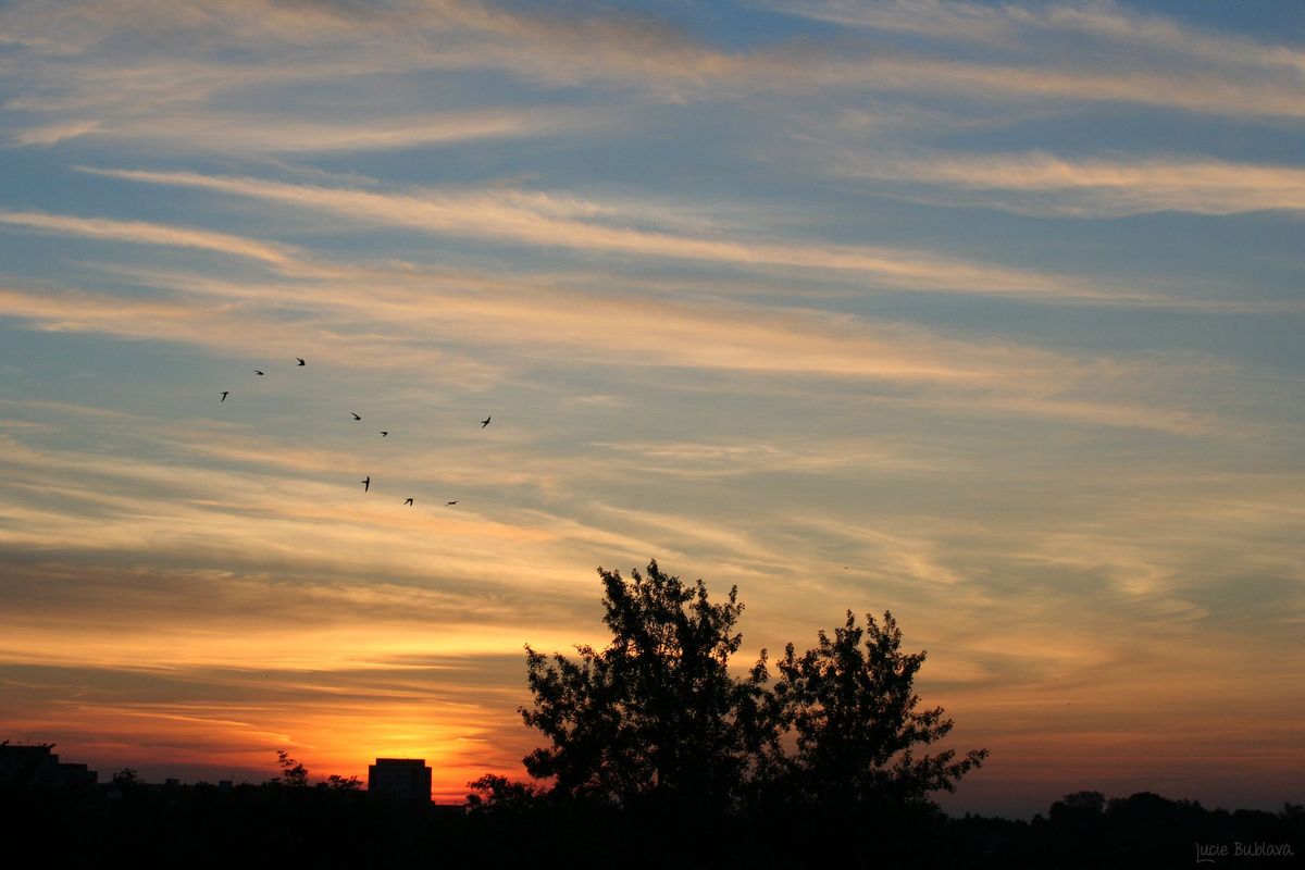 facebooková přítelkyně, zpěvačka skupiny Šansonika Lucie Bublavá mi poslala svou úžasnou fotografii, na které se jí povedlo zachytit hejno vlaštovek, které dokonce i počtem odpovídá tvaru souhvězdí Velký vůz. Je to fotografie, která se povede málokomu a málokdy. Určitě je hodna básně, a navíc Orlová… ten kraj mám moc rád, koneckonců před víc než dvěma roky jsem napsal báseň Nad Lučinou💖💖💖